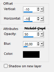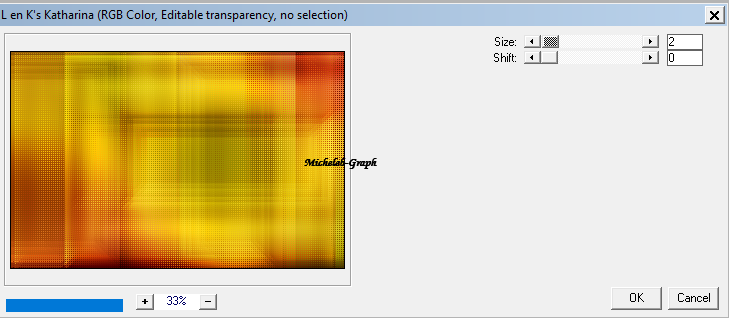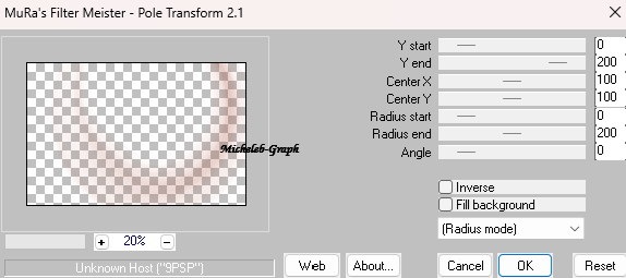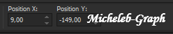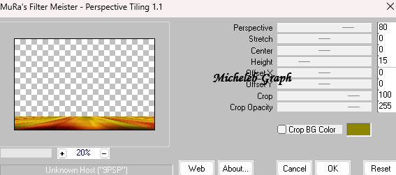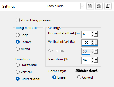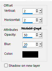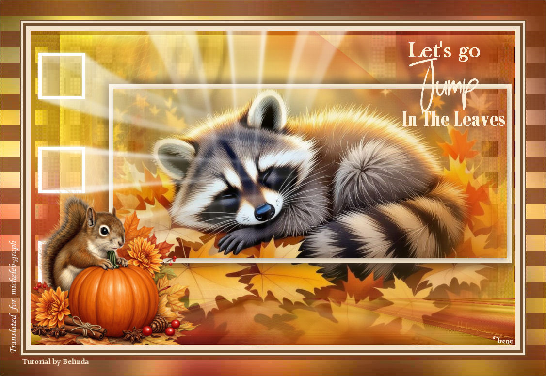 4 Filters - Toadies - What are You ? ![]() Layers - duplicate 5 Image - free rotation 90°, on the right ![]() 6 Effects - Image effects - seamless mosaic: Lado a lado ![]() Blend mode on the layer: Overlay 7 Layers - merge - merge visible Filters - L& K's: Katharina ![]() 8 Open and copy Deco-1LetsGoJump Paste a new layer Select tool (K) Pos X: 30 - Pos Y: 80 9 Filters - MuRa's Meister: Pole Transform ![]() Blend Mode of the layer: Multiply 10 Selections - load/Save a - selection from an alpha channel - load the selection #1 ![]() Press the "supprim" key on your keyboard or Edition - cut Selections - select none 11 Open and copy the layer Deco-2letsgojump Paste as new layer Select tool (K) Pos X: 225 - Pos Y: 0 12 Open and copy the layer Misted-LetsgoJump Paste as new layer Objects - Align - Right Adjust - sharpen - sharpness 13 Layers - new layer Selections - Load/Save a selection - load selection from a channel alpha - load selection #2 ![]() 14 Activate your paint bucket tool - fill the color layer 3 #ffffff Selections - modify - contract ![]() Press the "delete" key on your keyboard or Edit - cut Keep the selection 15 Activate Raster 3 (Landscape) Effects - 3D effects - Drop Shadow ![]() Repeat the effect with negatives values ![]() 16 Activate Raster 4 Effects - 3D effects - Drop Shadow ![]() 17 Close Raster 2 - 3 and 4 ![]() Layers - merge - merge visible Layers - duplicate 18 Filters - MuRa's Meister: Perspective Tiling ![]() Open the layers closed 19 Activate the layer by top of the pile Open and copy the layer Deco-3LetsgoJump Paste as new layer Select tool (K) Pos X: 9 - PosY: -149 20 Open and copy your tube primary folder Resize if necessary Paste as new layer Select tool (K) Pos X: 24 - Pos Y: 40 21 Open and copy the layer leaves-letsgoJump Paste as new layer Image - resize this layer to 85% Select tool (K) Pos X: 360 - Pos Y: 430 22 Open and copy the layer Squirrel-LetsgoJump Paste as new layer Image - resize this layer to 60% Select tool (K) Pos X: 709 - Pos Y: 367 23 Open and copy the layer WD-LetsgoJump Paste as new layer Select tool (K) Pos X: 683 - Pos Y: 56 24 Edit - Copy special - copy with merge Image - add borders 10 px - color 3 #ffffff 5 px - color 2 #8d8600 5 px - color 3 #ffffff 2 px - color 2 #8d8600 40 px - color 3 #ffffff 25 Magic wand tool - zero tolerance - select the border Paste in selection Adjust - blur - Gaussian blur: previous settings 26 Filters - Graphics Plus: Cross Shadow ![]() 27 Effects - effects of textures - blinds ![]() Adjust - sharpen - sharpness Selections - select none 28 Add your signature on a new layer Add Belinda’s signature Add my signature Translation Micheleb-Graph Image - add borders 1 px - color #8d8600 File - save in Jpeg format ![]() Your creation is complete You can send it to me by email ![]() ![]() My version ![]() Version of my tester Irene ![]() Gallery Index ![]() Ce(tte) œuvre est mise à disposition selon les termes de la Licence Creative Commons Attribution - Pas d’Utilisation Commerciale - Pas de Modification 3.0 France.  |