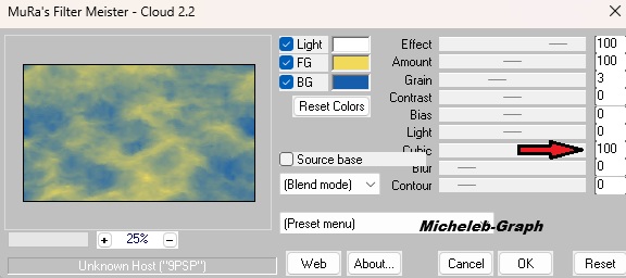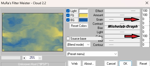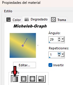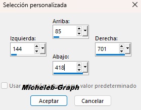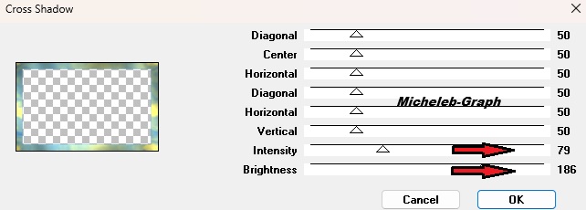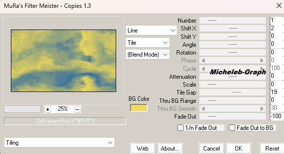![]() ![]() Gracias Mary por permitir que traduzca sus tutoriales Material Material Imagen y descripción inutilizables como tu propia biblioteca de y no puedes publicarlas en otro lugar sin el permiso de NaiseM. Gracias. Filtros Utilizados MuRa's Meister - Cloud & Copies AAA Filters - Frame Transparent VM Toolbox - Grid Graphics Plus - Cross Shadow Colors ![]() Primer plano: #f1da59 Fondo: #165eab 1 Abrir una nueva imagen transparente de 850 x 500 px Rellene con el color blanco #ffffff 2 Capas - nueva capa Filtros - MuRa’s Meister - Cloud *El resultado es aleatorio y será diferente de la captura* ![]() Opacidad de la capa a 60 3 Abrir y copiar Leda-dekor mts Pegar como nueva capa Opacidad de la capa a 28 *Personalmente, hice como Coly, dejé la opacidad en 100 o de lo contrario no se vería* 4 Capas - nueva capa Hacer un gradiente lineal ![]() Rellenar con el degradado 5 Ajuste - desenfoque - desenfoque gaussiano a 45 Filtros - AAA Filters - Transparent Frame ![]() Imagen - cambiar tamaño a 60% *Todas las capas SIN marcar* ![]() 6 Herramienta de selección - selección personalizada ![]() Pulse la tecla "suppr" en su teclado Selecciones - no seleccionar nada 7 Filtros - MuRa’s Meister - Copias ![]() 8 Herramienta de selección - selección personalizada ![]() Selecciones - convertir la selección en una capa Selecciones - no seleccionar nada Imagen - cambiar tamaño a 60% *Todas las capas SIN marcar* ![]() Colocar correctamente 9 Con tu varilla mágica "Tolerancia y progresividad: 0) Seleccionar centro de capa ![]() 10 Filtros - VM Toolbox - Grid ![]() Selecciones - no seleccionar nada 11 Colocarte en la capa inferior (Raster4) Efectos - efectos de reflexión - Espejo rotativo ![]() Resultado ![]() 12 Abrir y copiar Keret.mts-2026 Está bien ubicado 13 Colocarte en la capa superior de la pila Abrir y copiar dekor 1-mts-2026 Está bien ubicado 14 Abrir y copiar dekor 2-mts-2026 Pegar como nueva capa Posicionar (K en el teclado) ![]() Pulse "M" para desactivar Abrir y copiar dekor 3-mts-2026 Pegar como nueva capa Posicionar (K en el teclado) ![]() Pulse "M" para desactivar Abrir y copiar dekor 4-mts-2026 Pegar como nueva capa Posicionar (K en el teclado) ![]() Pulse "M" para desactivar 15 Selecciones - seleccionar todo Imágenes - añadir bordes 40 px - cualquier color Selecciones - invertir Filtros - MuRa’s Meister - Cloud Ajustes de memoria ![]() 16 Filtros - Graphics Plus - Cross Shadow ![]() 17 Selecciones - invertir Efectos - 3D - sombra a la vista - negro V&H: 0 - 60 - 35 - #000000 Selecciones - no seleccionar nada 18 Imágenes - añadir bordes 5 px - #ffffff 2 px - #165eab 5 px - #ffffff 2 px - #165eab 5 px - #ffffff 19 Abrir y copiar el tubo principal Pegar como nueva capa Posicionar (K en el teclado) ![]() Pulse "M" para desactivar Sombra almacenada (o a elección) 20 Abrir y copiar el tubo de texto Pegar como nueva capa Posicionar (K en el teclado) ![]() Pulse "M" para desactivar *Utilice la herramienta de cambio de color para colorear* 21 Añadir su firma Añadir la firma de Mary Añadir mi firma Traducción Micheleb-Graph Claques - fusión - fusionar todo Guardar como.jpg Gracias por seguir este tutorial, espero que sea así Hecho el 15 de febrero de 2026 - Traducido el 6 de abril de 2026 Puede enviarme su creación por correo electrónico si lo desea. ![]() Mi versión personal ![]() INDEX ![]() Ce(tte) œuvre est mise à disposition selon les termes de la Licence Creative Commons Attribution - Pas d’Utilisation Commerciale - Pas de Modification 3.0 France. |